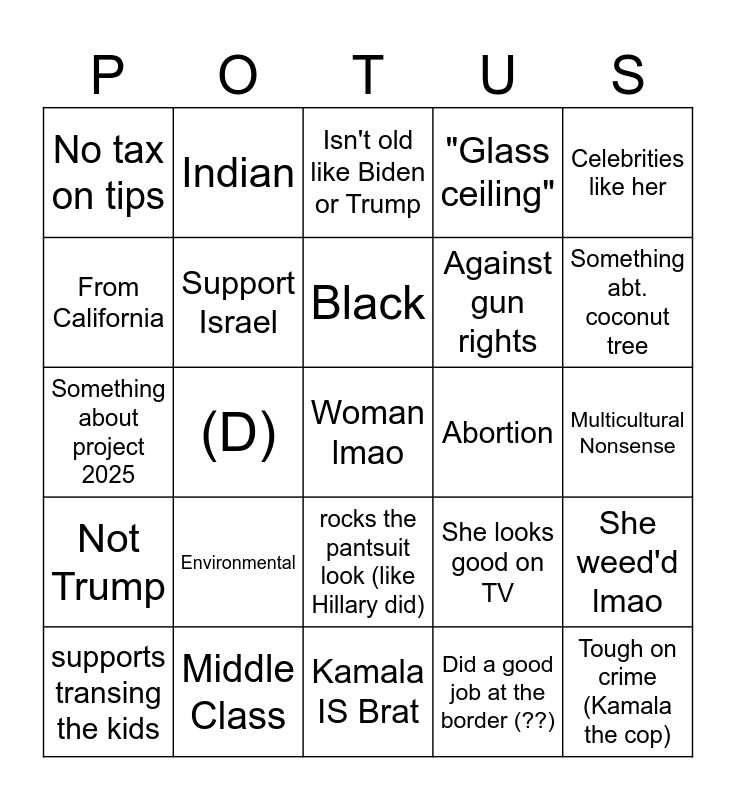 This bingo card has a free space and 24 words: Environmental, Middle Class, Black, supports transing the kids, Celebrities like her, No tax on tips, From California, Indian, Abortion, rocks the pantsuit look (like Hillary did), Against gun rights, Something about project 2025, She looks good on TV, She weed'd lmao, Support Israel, Did a good job at the border (??), Multicultural Nonsense, Isn't old like Biden or Trump, Something abt. coconut tree, (D), Tough on crime (Kamala the cop), Not Trump, "Glass ceiling" and Kamala IS Brat.