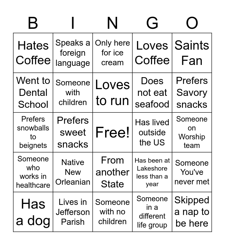 This bingo card has a free space and 24 words: Native New Orleanian, Lives in Jefferson Parish, Loves to run, Has a dog, Saints Fan, Hates Coffee, Went to Dental School, Speaks a foreign language, Has lived outside the US, From another State, Does not eat seafood, Prefers snowballs to beignets, Has been at Lakeshore less than a year, Someone You've never met, Someone with children, Someone in a different life group, Someone on Worship team, Only here for ice cream, Prefers Savory snacks, Prefers sweet snacks, Skipped a nap to be here, Someone who works in healthcare, Loves Coffee and Someone with no children.