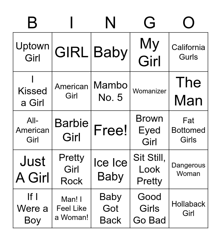 This bingo card has a free space and 62 words: Girls Just Want to Have Fun, Man! I Feel Like a Woman!, Run the World (Girls), Just A Girl, Girl of Fire, I’m Every Woman, American Girl, Single Ladies, Womanizer, Where My Girls At, My Girl, Girlfriend, I Kissed a Girl, Fell in Love With a Girl, Are You Gonna Be My Girl, Uptown Girl, Hollaback Girl, California Gurls, Jessie’s Girl, Mambo No. 5, Brown Eyed Girl, Baby, If I Were a Boy, Good Girls Go Bad, Woman, She’s Always a Woman, Witchy Woman, God is a Woman, Dangerous Woman, Redneck Woman, Woman’s World, No Woman, No Cry, mad woman, I’m Every Woman, Fat Bottomed Girls, GIRL, Rich Girl, Isn’t She Lovely, Barbie Girl, This One’s for the Girls, All-American Girl, God Made Girls, Pretty Girl Rock, What a Girl Wants, The Man, Sit Still, Look Pretty, Only Girl (In the World), Baby One More Time, Material Girl, She’s so High, Ice Ice Baby, Baby Got Back, She Will be Loved, Girl, Femininomenon, Daughter, Daughters, Daddy’s Little Girl, I Loved Her First, Butterfly Kisses, In My Daughter’s Eyes and The Best Day.