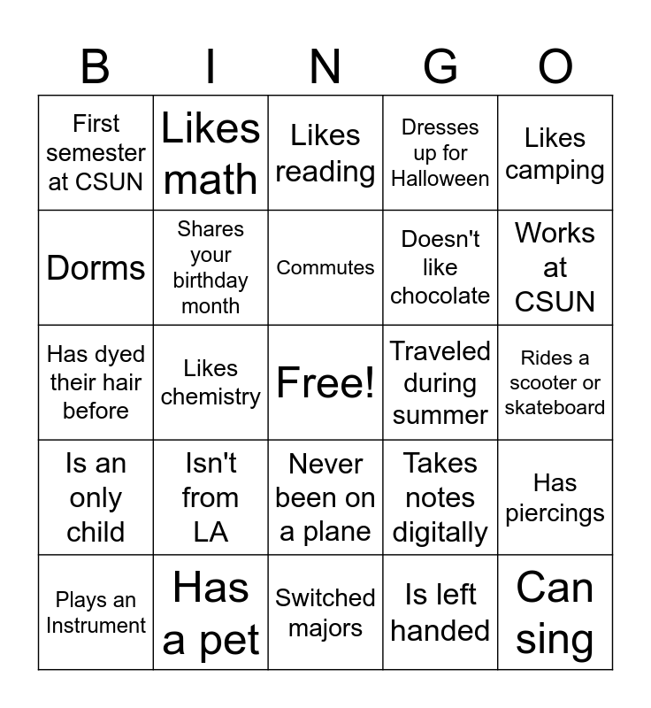 This bingo card has a free space and 29 words: Plays an Instrument, Doesn't drink coffee, Likes chemistry, Gamer, First semester at CSUN, Likes reading, Shares your birthday month, Isn't from LA, Traveled during summer, Has a pet, Rides a scooter or skateboard, Can sing, Switched majors, Is left handed, Works at CSUN, Favorite season is summer, Never been on a plane, Is an only child, Likes camping, Has dyed their hair before, Takes notes digitally, Plays a sport, Doesn't like chocolate, Dorms, Dresses up for Halloween, Likes math, Has piercings, Commutes and Has been to a concert.