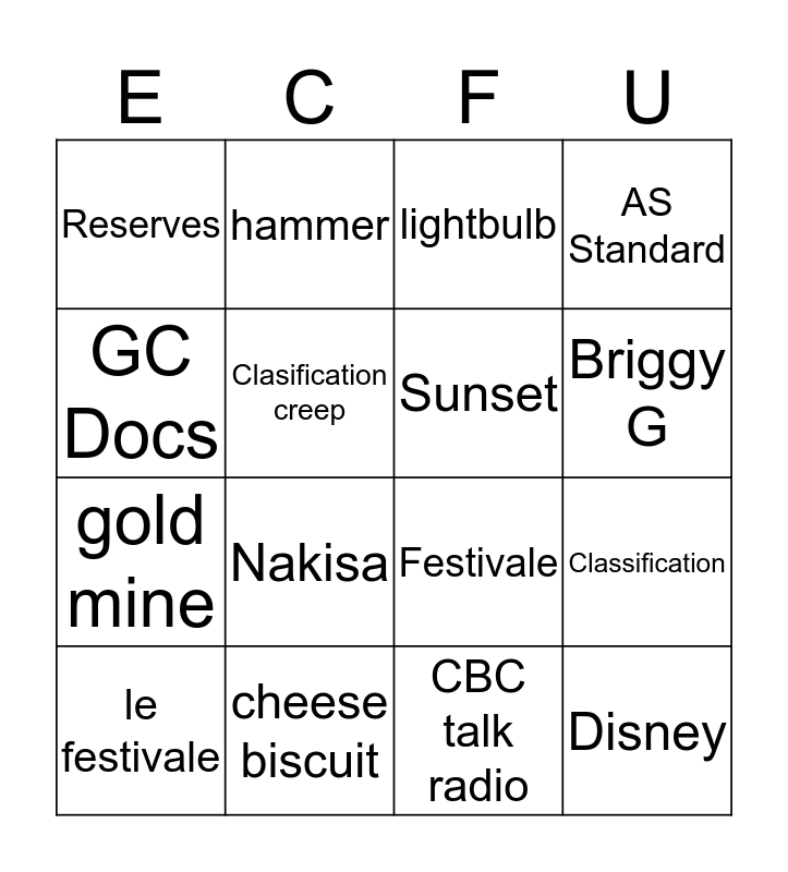 This bingo card has a free space and 21 words: cheese biscuit, Angie, hammer, moo, CBC talk radio, Sunset, Reserves, lightbulb, Disney, Briggy G, gold mine, AS Standard, potato chips, Barry Johnston, Clasification creep, Ghost of xmas future, le festivale, Nakisa, GC Docs, Classification and Staffing.