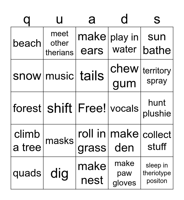 This bingo card has a free space and 24 words: quads, masks, tails, make paw gloves, sun bathe, beach, meet other therians, make ears, vocals, hunt plushie, forest, music, make den, collect stuff, snow, dig, make nest, play in water, territory spray, climb a tree, shift, roll in grass, chew gum and sleep in theriotype positon.