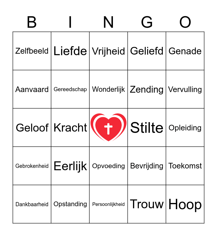 This bingo card has a free space and 35 words: Jezus, Identiteit, Vader God, Gereedschap, Opvoeding, Geliefd, Aanvaard, Zegen, Wonderlijk, prijsgegeven, Geloof, Genade, Geborgenheid, Vergeving, Zelfbeeld, Stilte, Trouw, Kracht, Gebrokenheid, Hoop, Bevrijding, Dankbaarheid, Toekomst, Opstanding, Vrijheid, Vervulling, Kerk, Getuigenis, Zending, Opleiding, Timmerman, Persoonlijkheid, Eerlijk, Liefde and Gebed.