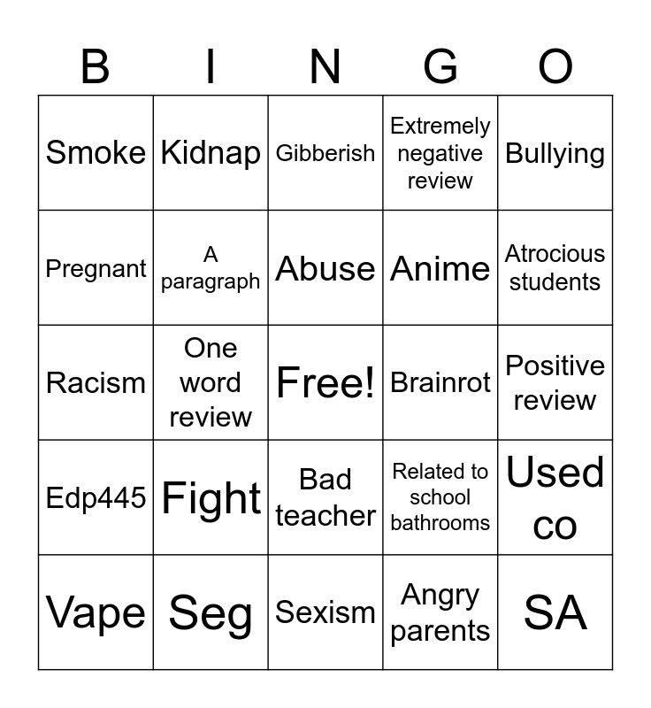 This bingo card has a free space and 24 words: Fight, Seg, Abuse, Vape, Bullying, Smoke, Pregnant, Kidnap, Brainrot, Bad teacher, Anime, Racism, Related to school bathrooms, Used co, A paragraph, Angry parents, Positive review, Gibberish, Atrocious students, One word review, SA, Edp445, Extremely negative review and Sexism.