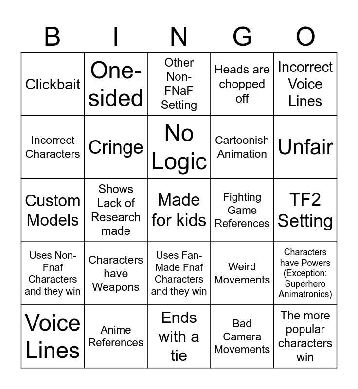 This bingo card has a free space and 24 words: Characters have Weapons, Anime References, No Logic, Voice Lines, Incorrect Voice Lines, Clickbait, Incorrect Characters, One-sided, Fighting Game References, Uses Fan-Made Fnaf Characters and they win, Cartoonish Animation, Custom Models, Weird Movements, Characters have Powers (Exception: Superhero Animatronics), Cringe, Bad Camera Movements, TF2 Setting, Other Non-FNaF Setting, Unfair, Shows Lack of Research made, The more popular characters win, Uses Non-Fnaf Characters and they win, Heads are chopped off and Ends with a tie.