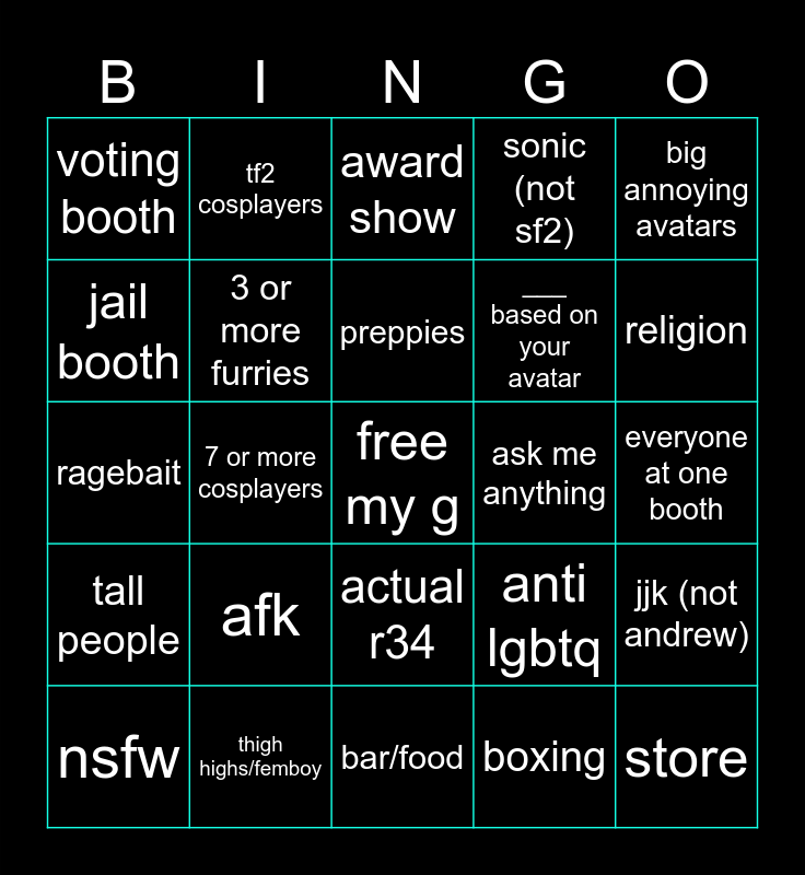 This bingo card has a free space and 29 words: nsfw, regretevator, 7 or more cosplayers, edgy, voting booth, award show, 3 or more furries, afk, ask me anything, thigh highs/femboy, everyone at one booth, store, bar/food, boxing, religion, baby bill, actual r34, tall people, big annoying avatars, ragebait, anti lgbtq, antifur, ___ based on your avatar, jail booth, sonic (not sf2), tf2 cosplayers, jjk (not andrew), preppies and dumb questions.
