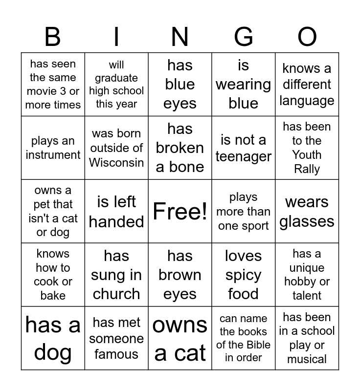 This bingo card has a free space and 24 words: has sung in church, has met someone famous, has broken a bone, has a dog, knows a different language, has seen the same movie 3 or more times, plays an instrument, will graduate high school this year, plays more than one sport, has brown eyes, is not a teenager, owns a pet that isn't a cat or dog, loves spicy food, has a unique hobby or talent, was born outside of Wisconsin, can name the books of the Bible in order, wears glasses, has blue eyes, has been to the Youth Rally, is left handed, has been in a school play or musical, knows how to cook or bake, is wearing blue and owns a cat.