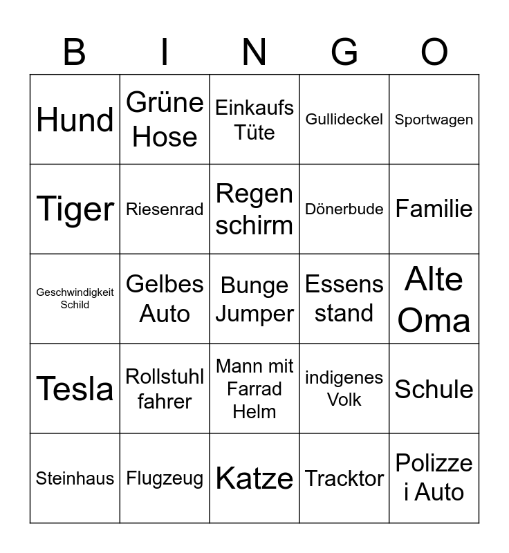 This bingo card has 25 words: Rollstuhl fahrer, Katze, Regen schirm, Steinhaus, Sportwagen, Hund, Tiger, Grüne Hose, Essens stand, Mann mit Farrad Helm, Dönerbude, Geschwindigkeit Schild, indigenes Volk, Schule, Riesenrad, Polizze i Auto, Alte Oma, Einkaufs Tüte, Familie, Gelbes Auto, Bunge Jumper, Flugzeug, Tesla, Gullideckel and Tracktor.