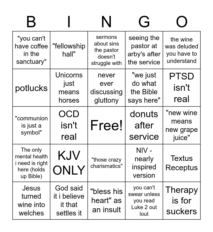 This bingo card has a free space and 24 words: KJV ONLY, God said it i believe it that settles it, never ever discussing gluttony, Jesus turned wine into welches, the wine was deluded you have to understand, "you can't have coffee in the sanctuary", potlucks, "fellowship hall", donuts after service, "those crazy charismatics", "we just do what the Bible says here", "communion is just a symbol", NIV - nearly inspired version, Textus Receptus, Unicorns just means horses, you can't swear unless you read Luke 2 out lout, "new wine means new grape juice", sermons about sins the pastor doesn't struggle with, PTSD isn't real, OCD isn't real, Therapy is for suckers, The only mental health i need is right here (holds up Bible), seeing the pastor at arby's after the service and "bless his heart" as an insult.