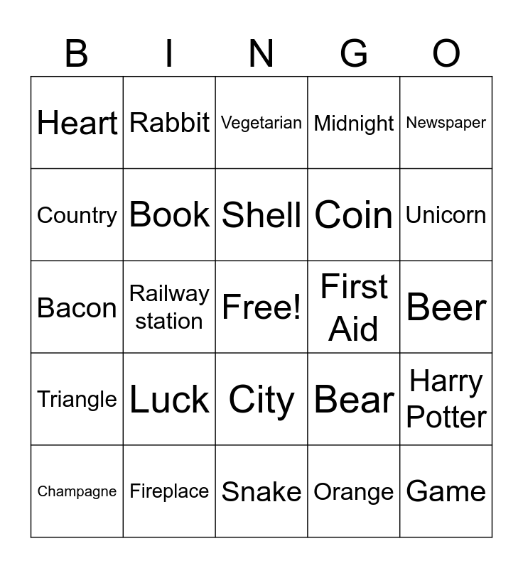 This bingo card has a free space and 24 words: Luck, Fireplace, Shell, Champagne, Newspaper, Heart, Country, Rabbit, First Aid, City, Coin, Bacon, Bear, Harry Potter, Book, Orange, Beer, Vegetarian, Unicorn, Railway station, Game, Triangle, Midnight and Snake.