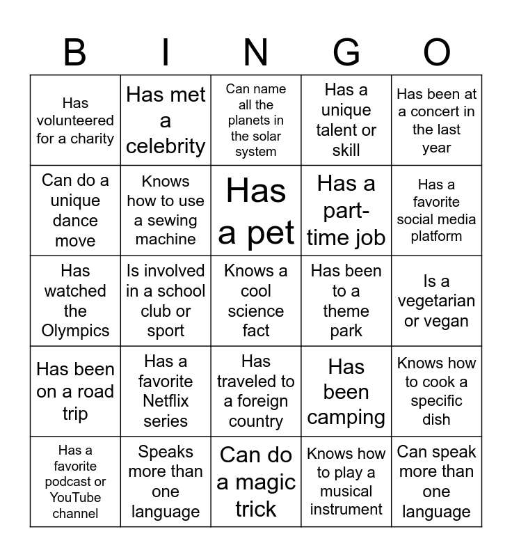 This bingo card has 26 words: Has traveled to a foreign country, Knows how to play a musical instrument, Has a pet, Speaks more than one language, Has been at a concert in the last year, Has volunteered for a charity, Can do a unique dance move, Has met a celebrity, Is a vegetarian or vegan, Has been camping, Has a part-time job, Has watched the Olympics, Knows how to cook a specific dish, Has a favorite podcast or YouTube channel, Is involved in a school club or sport, Can recite a poem or quote from memory, Has a unique talent or skill, Has been on a road trip, Can name all the planets in the solar system, Knows a cool science fact, Has a favorite social media platform, Can do a magic trick, Has been to a theme park, Has a favorite Netflix series, Knows how to use a sewing machine and Can speak more than one language.