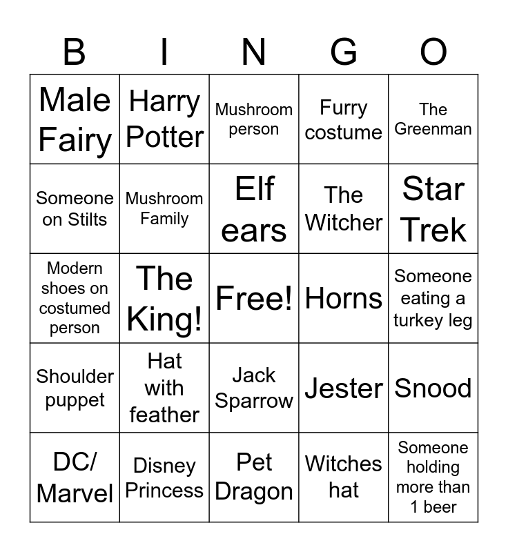This bingo card has a free space and 31 words: Pet Dragon, Big sword, The King!, Female Fairy, Male Fairy, Mushroom person, Mushroom Family, Jester, Horns, Witches hat, Someone eating a turkey leg, Someone holding more than 1 beer, Kilt, no shirt, Plague doctor, Star Trek, Star Wars, Snood, Hat with feather, Shoulder puppet, Jack Sparrow, The Greenman, Krampus, DC/ Marvel, Harry Potter, The Witcher, Someone on Stilts, Furry costume, Modern shoes on costumed person, Disney Princess, Elf ears and Manny the Stag.