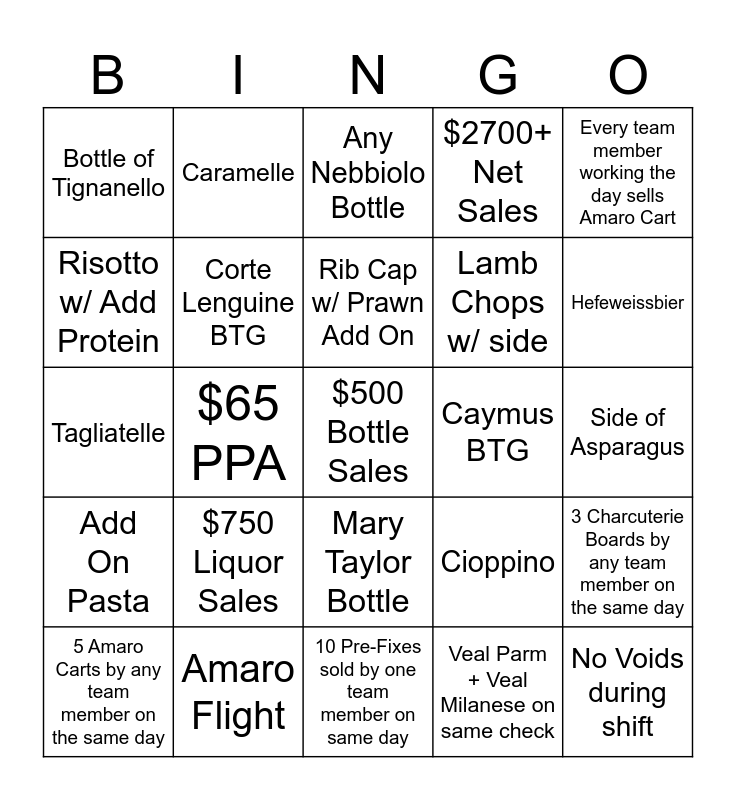 This bingo card has a free space and 24 words: 5 Amaro Carts by any team member on the same day, $750 Liquor Sales, Rib Cap w/ Prawn Add On, Veal Parm + Veal Milanese on same check, Every team member working the day sells Amaro Cart, Bottle of Tignanello, Caramelle, Any Nebbiolo Bottle, Caymus BTG, Side of Asparagus, Tagliatelle, Corte Lenguine BTG, Cioppino, 3 Charcuterie Boards by any team member on the same day, Risotto w/ Add Protein, Amaro Flight, 10 Pre-Fixes sold by one team member on same day, $2700+ Net Sales, Hefeweissbier, Add On Pasta, $65 PPA, Mary Taylor Bottle, Lamb Chops w/ side and No Voids during shift.