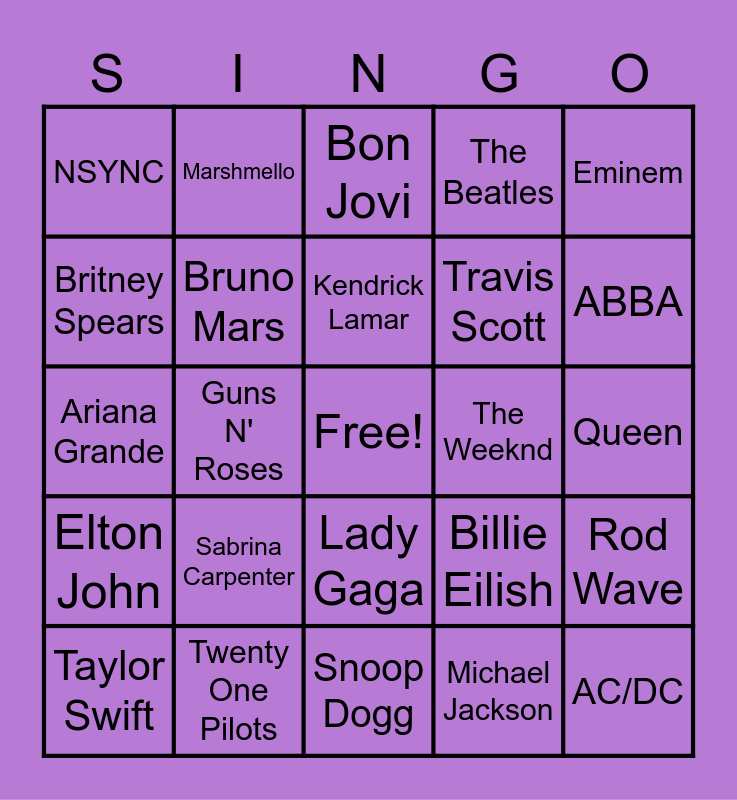 This bingo card has a free space and 24 words: Sabrina Carpenter, Twenty One Pilots, Kendrick Lamar, Taylor Swift, Eminem, NSYNC, Britney Spears, Marshmello, The Weeknd, Lady Gaga, Travis Scott, Ariana Grande, Billie Eilish, Rod Wave, Bruno Mars, Michael Jackson, Queen, Bon Jovi, ABBA, Guns N' Roses, AC/DC, Elton John, The Beatles and Snoop Dogg.