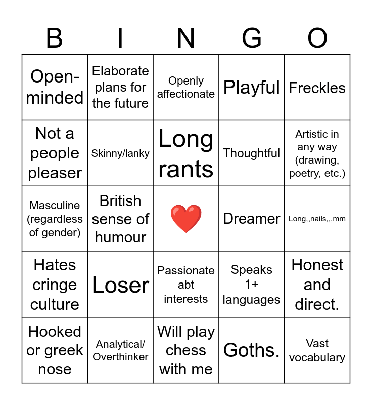 This bingo card has a free space and 24 words: Loser, Analytical/ Overthinker, Long rants, Hooked or greek nose, Freckles, Open-minded, Not a people pleaser, Elaborate plans for the future, Dreamer, Passionate abt interests, Thoughtful, Masculine (regardless of gender), Speaks 1+ languages, Honest and direct., Skinny/lanky, Goths., Long,,nails,,,mm, Openly affectionate, Artistic in any way (drawing, poetry, etc.), British sense of humour, Vast vocabulary, Hates cringe culture, Playful and Will play chess with me.