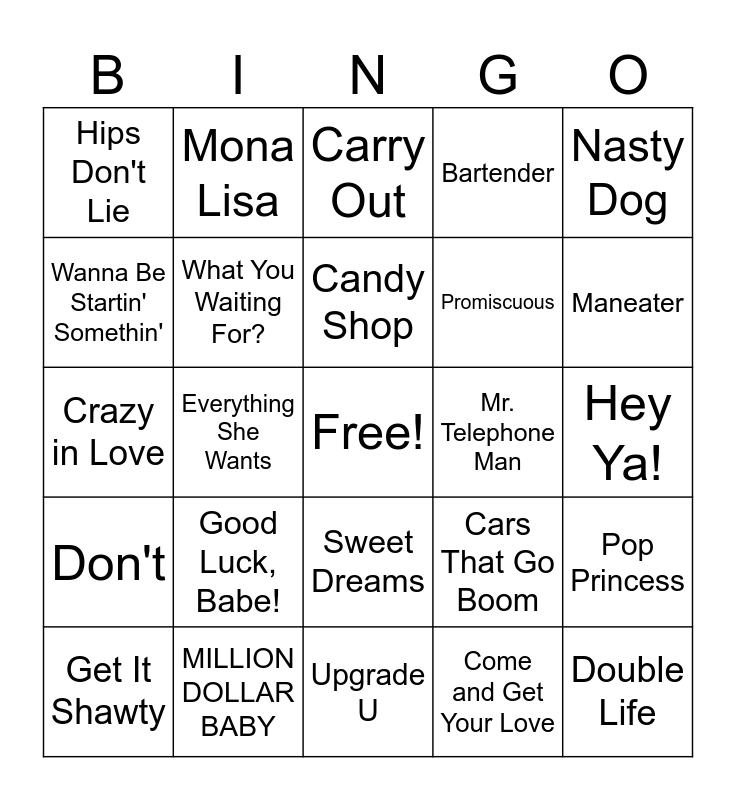 This bingo card has a free space and 60 words: Mambo No. 5, MILLION DOLLAR BABY, My Humps, Don't, Come and Get Your Love, Flashing Lights, What You Waiting For?, I'm Sprung, Promiscuous, Toxic, Bartender, Let Me Clear My Throat, Wanna Be Startin' Somethin', Tainted Love, Bootylicious, Hips Don't Lie, Double Life, Nasty Dog, Mary Jane, Candy Shop, Mr. Telephone Man, Carry Out, Get It Shawty, Pop Princess, Crazy, Ms. Jackson, Buy U a Drank, Bad Habit, Maneater, Man! I Feel Like a Woman!, My Boo, Who's Crying Now, Super Freak, It's My Party, Mona Lisa, Love Is a Battlefield, SexyBack, Everything She Wants, American Boy, Crazy in Love, Baby Boy, Good Luck, Babe!, Hey Ya!, Single Ladies, Cars That Go Boom, Green Light, Get Busy, Little Lies, Let's Get It Started, Sweet Dreams, Upgrade U, Wake Me Up Before You Go Go, Low, Are You That Somebody, Mystery Lady, Make Me Better, And the Beat Goes On, Sing, bad guy and Feel Good Inc..