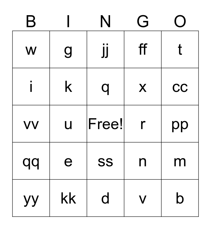 This bingo card has a free space and 52 words: a, b, c, d, e, f, g, h, i, j, k, l, m, n, o, p, q, r, s, t, u, v, w, x, y, z, aa, bb, cc, dd, ee, ff, gg, hh, ii, jj, kk, ll, mm, nn, oo, pp, qq, rr, ss, tt, uu, vv, ww, xx, yy and zz.