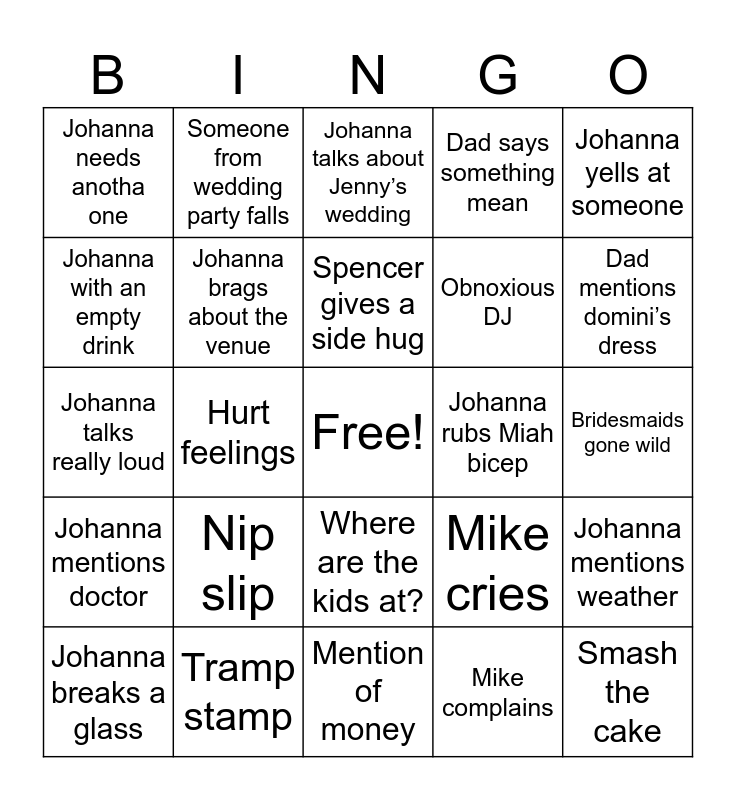 This bingo card has a free space and 24 words: Johanna breaks a glass, Nip slip, Spencer gives a side hug, Mike complains, Johanna yells at someone, Johanna needs anotha one, Someone from wedding party falls, Johanna talks about Jenny’s wedding, Johanna rubs Miah bicep, Bridesmaids gone wild, Johanna talks really loud, Johanna brags about the venue, Mike cries, Johanna mentions weather, Johanna with an empty drink, Tramp stamp, Mention of money, Dad says something mean, Dad mentions domini’s dress, Johanna mentions doctor, Hurt feelings, Where are the kids at?, Obnoxious DJ and Smash the cake.