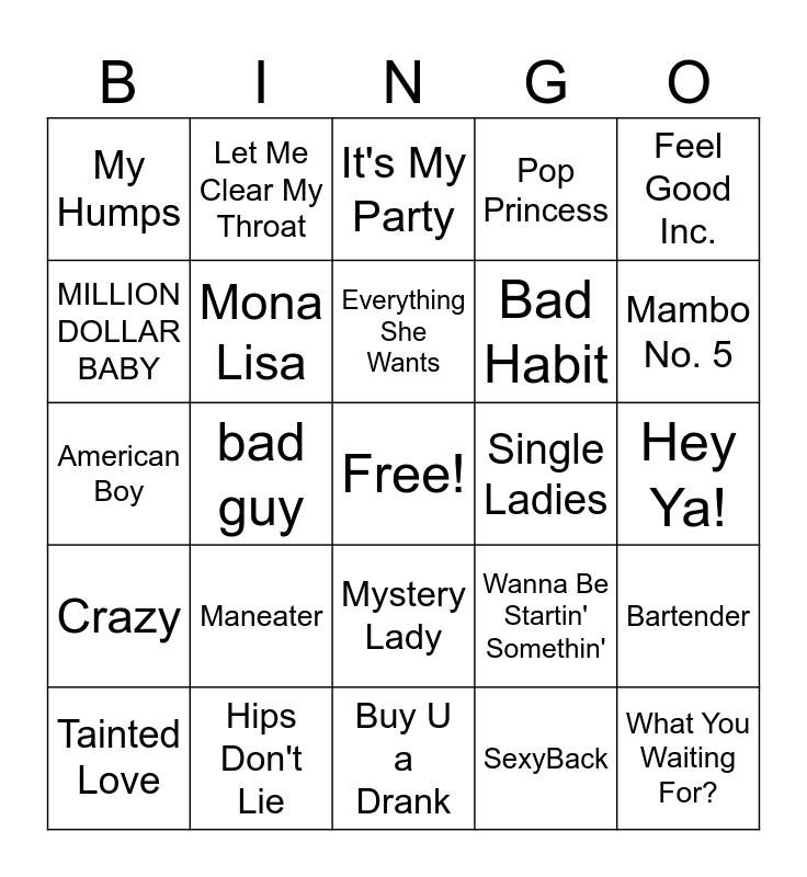 This bingo card has a free space and 60 words: Ms. Jackson, Hips Don't Lie, Sweet Dreams, Crazy, SexyBack, Baby Boy, Mona Lisa, Don't, Bad Habit, Upgrade U, Pop Princess, Good Luck, Babe!, MILLION DOLLAR BABY, Get Busy, Nasty Dog, My Humps, What You Waiting For?, Feel Good Inc., Wake Me Up Before You Go Go, Everything She Wants, Single Ladies, It's My Party, Tainted Love, Bartender, Promiscuous, Little Lies, Are You That Somebody, Cars That Go Boom, Mambo No. 5, Come and Get Your Love, Who's Crying Now, Low, Candy Shop, Sing, Let Me Clear My Throat, Make Me Better, Double Life, bad guy, Flashing Lights, American Boy, Carry Out, Maneater, Hey Ya!, Mary Jane, Wanna Be Startin' Somethin', My Boo, Man! I Feel Like a Woman!, Super Freak, Crazy in Love, Mystery Lady, Buy U a Drank, Green Light, Love Is a Battlefield, Get It Shawty, And the Beat Goes On, Toxic, Let's Get It Started, Mr. Telephone Man, Bootylicious and I'm Sprung.