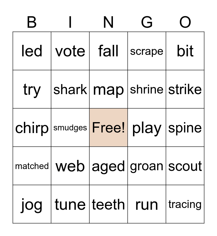 This bingo card has a free space and 24 words: jog, web, map, run, bit, led, vote, fall, play, spine, chirp, shark, groan, scout, try, tune, teeth, scrape, strike, matched, smudges, aged, shrine and tracing.