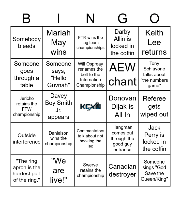 This bingo card has a free space and 49 words: Chris Jericho speaks in a British accent, Someone sings "God Save the Queen/King", Someone sings "The Star Spangled Banner", Swerve retains the championship, Danielson wins the championship, "Timeless" Toni Storm retains, Mariah May wins, The Young Bucks hit 6+ superkicks, Someone goes through a table, Three ladders are set up in the ring at once, Someone says, "Hello Guvnah", Darby Allin is locked in the coffin, Jack Perry is locked in the coffin, Hangman comes out through the good guy entrance, MJF keeps the American championship, Will Ospreay wins the American championship, Will Ospreay renames the belt to the Internation Championship, Donovan Dijak is All In, Betrayal, Keith Lee returns, Davey Boy Smith Jr. appears, Canadian destroyer, Somebody bleeds, AEW chant, Excalibur says, “We have got to restore order!”, Tony Schiavone talks about "the numbers game", "The ring apron is the hardest part of the ring.", Cowboy Sh!t, Commentators talk about not hooking the leg, Outside interference, "Instant classic", "Tippy top rope", Britt Baker D.M.D., Orange Cassidy gives a thumbs up, "We are live!", Orange Cassidy puts his hands in his pockets, Samoa Joe walks away, Christian Cage in a turtleneck, Referee gets wiped out, Bald referee, "One more time" chant, Orange Cassidy survives gauntlet, Former WWE Superstar Debuts, Hook wins the FTW championship, Jericho retains the FTW championship, FTR wins the tag team championships, The Acclaimed win the tag team championships, The Young Bucks retain the tag team championships and Jamie Hayter returns.