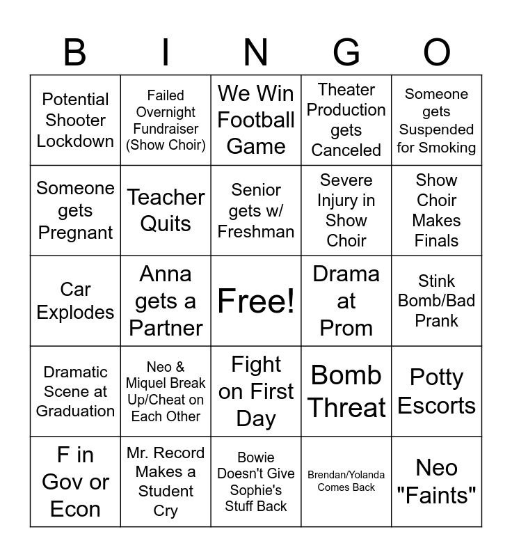 This bingo card has a free space and 24 words: Neo & Miquel Break Up/Cheat on Each Other, Mr. Record Makes a Student Cry, Senior gets w/ Freshman, F in Gov or Econ, Someone gets Suspended for Smoking, Potential Shooter Lockdown, Someone gets Pregnant, Failed Overnight Fundraiser (Show Choir), Drama at Prom, Fight on First Day, Severe Injury in Show Choir, Car Explodes, Bomb Threat, Potty Escorts, Teacher Quits, Brendan/Yolanda Comes Back, Stink Bomb/Bad Prank, We Win Football Game, Show Choir Makes Finals, Anna gets a Partner, Neo "Faints", Dramatic Scene at Graduation, Theater Production gets Canceled and Bowie Doesn't Give Sophie's Stuff Back.