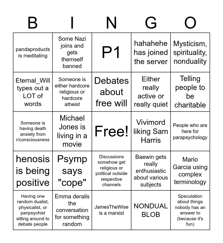 This bingo card has a free space and 24 words: Psymp says "cope", Emma derails the conversation for something random, Debates about free will, Having one random dualist, physicalist, or panpsychist sitting around to debate people, Mysticism, spirituality, nonduality, pandaproducts is meditating, Eternal_Will types out a LOT of words, Some Nazi joins and gets themself banned, Vivimord liking Sam Harris, Discussions somehow get religious or political outside respective channels, Either really active or really quiet, Someone is having death anxiety from r/consciousness, Baewin gets really enthusiastic about various subjects, Mario Garcia using complex terminology, Someone is either hardcore religious or hardcore atheist, NONDUAL BLOB, People who are here for parapsychology, P1, Telling people to be charitable, Michael Jones is living in a movie, Speculation about things nobody has an answer to (because it's fun), henosis is being positive, hahahehe has joined the server and JamesTheWise is a marxist.