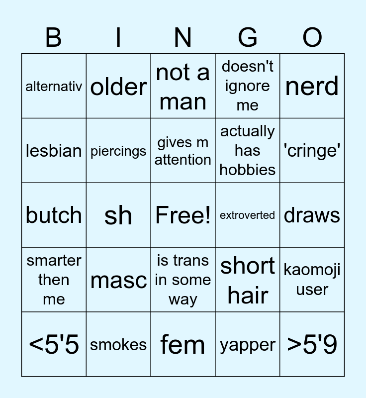 This bingo card has a free space and 24 words: <5'5, masc, gives m attention, yapper, nerd, alternativ, older, not a man, extroverted, draws, butch, piercings, short hair, kaomoji user, lesbian, smokes, fem, doesn't ignore me, 'cringe', smarter then me, sh, is trans in some way, actually has hobbies and >5'9.