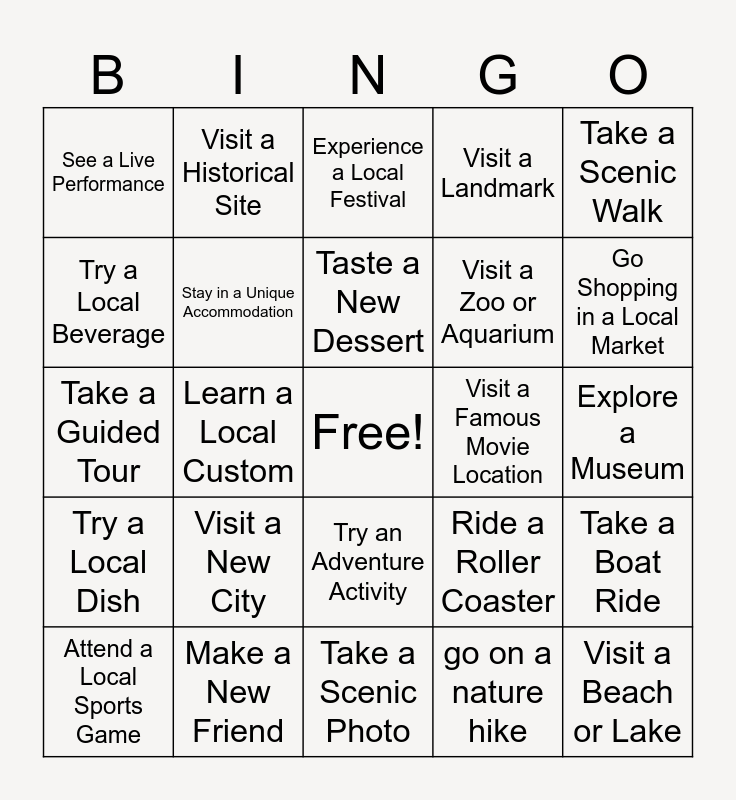 This bingo card has a free space and 24 words: Visit a New City, Make a New Friend, Taste a New Dessert, Attend a Local Sports Game, Take a Scenic Walk, See a Live Performance, Try a Local Beverage, Visit a Historical Site, Visit a Famous Movie Location, Try an Adventure Activity, Visit a Zoo or Aquarium, Take a Guided Tour, Ride a Roller Coaster, Take a Boat Ride, Stay in a Unique Accommodation, go on a nature hike, Explore a Museum, Experience a Local Festival, Go Shopping in a Local Market, Learn a Local Custom, Visit a Beach or Lake, Try a Local Dish, Visit a Landmark and Take a Scenic Photo.