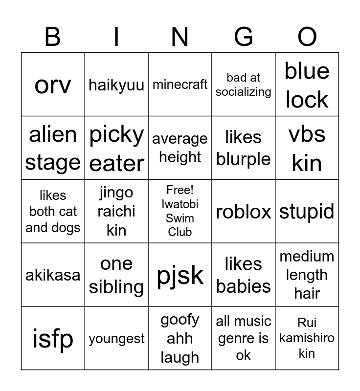 This bingo card has a free space and 24 words: one sibling, youngest, average height, isfp, blue lock, orv, alien stage, haikyuu, roblox, pjsk, likes blurple, likes both cat and dogs, likes babies, medium length hair, picky eater, all music genre is ok, stupid, minecraft, vbs kin, jingo raichi kin, Rui kamishiro kin, akikasa, bad at socializing and goofy ahh laugh.