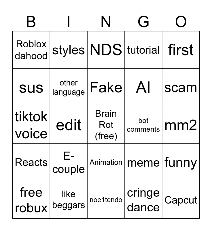 This bingo card has a free space and 24 words: E-couple, like beggars, Fake, free robux, first, Roblox dahood, sus, styles, bot comments, Animation, AI, tiktok voice, meme, funny, other language, cringe dance, mm2, NDS, scam, edit, Capcut, Reacts, tutorial and noe1tendo.