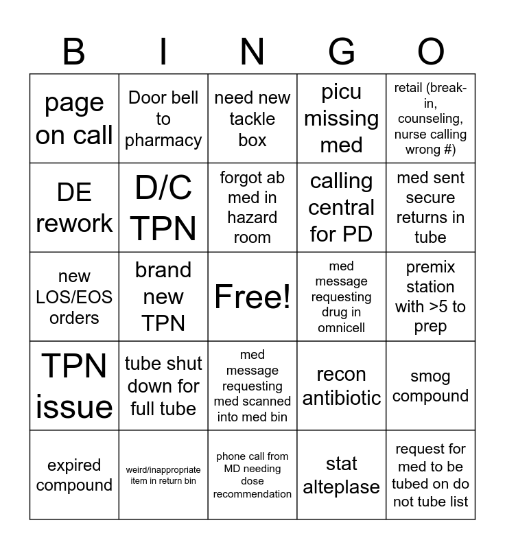 This bingo card has a free space and 58 words: Receive strange item in the tube, weird/inappropriate item in return bin, compatibility question, TPN issue, stat alteplase, temperature/pressure alarm, D/C TPN, IV hoarding stats, calling central for PD, code response needed, picu missing med, nurse has <1 hour on a drip, move meds between omnicell, med request for order put in <10 min ago, need med from central or nurse requesting item that comes from central, page on call, request for med to be tubed on do not tube list, retail (break-in, counseling, nurse calling wrong #), call to borrow a med, forgot ab med in hazard room, med message requesting drug in omnicell, need new tackle box, expired compound, smog compound, new chemo/chemo issue, premix station with >5 to prep, page or call NNP, rec from a consult service, med sent secure returns in tube, omnicell discrepancy, med not scanning (doseedge or nurse call), trauma B/stab code/OB c-section, expired med (not compound), new DKA needs bags STAT, calling maintenance or environmental services, pharm-is ticket, doseedge bypass, brand new TPN, new LOS/EOS orders, call from outside pharm to borrow med, tube shut down for full tube, request for vfc vaccine, recon antibiotic, ID home med, status board clear, request for on call electrolytes, omnicell issue, med message requesting med scanned into med bin, phone call from MD needing dose recommendation, critical dose warning override, need to make dilution narc, nurse calls and asks for med to be approved, extravasation question, epic queue clear, Door bell to pharmacy, IV room calls out for stock, DE rework and need to waste for a narc.