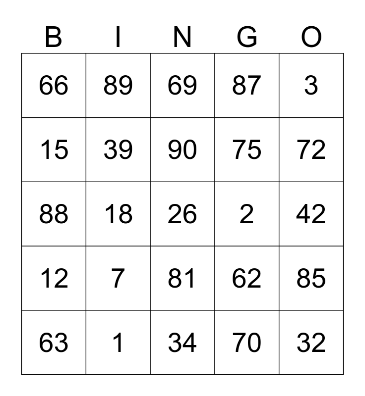 This bingo card has a free space and 24 words: 7, 1, 90, 63, 3, 66, 15, 89, 2, 81, 75, 88, 62, 85, 39, 70, 42, 69, 72, 18, 32, 12, 87 and 34.