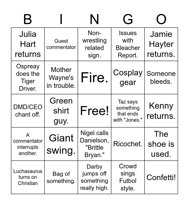This bingo card has a free space and 24 words: Giant swing., Bag of something., Fire., Luchasaurus turns on Christian, Jamie Hayter returns., Julia Hart returns, Ospreay does the Tiger Driver., Guest commentator, Taz says something that ends with "Jones.", Nigel calls Danielson, "Brittle Bryan.", Cosplay gear, DMD/CEO chant off., Ricochet., The shoe is used., Mother Wayne's in trouble., Crowd sings Futbol style., Kenny returns., Non-wrestling related sign., Someone bleeds., Green shirt guy., Confetti!, A commentator interrupts another., Issues with Bleacher Report. and Darby jumps off something really high..