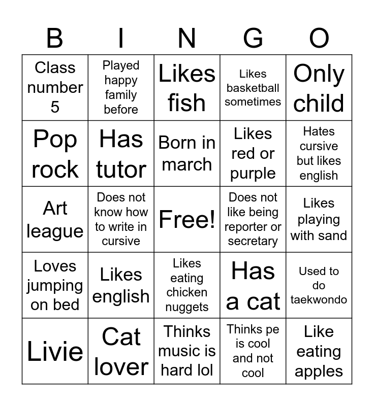 This bingo card has a free space and 24 words: Likes english, Cat lover, Born in march, Livie, Only child, Class number 5, Pop rock, Played happy family before, Does not like being reporter or secretary, Likes eating chicken nuggets, Likes red or purple, Art league, Has a cat, Used to do taekwondo, Has tutor, Thinks pe is cool and not cool, Likes playing with sand, Likes fish, Hates cursive but likes english, Does not know how to write in cursive, Like eating apples, Loves jumping on bed, Likes basketball sometimes and Thinks music is hard lol.