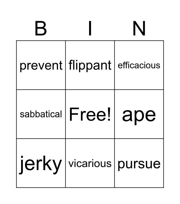 This bingo card has a free space and 8 words: ape, efficacious, flippant, jerky, prevent, pursue, sabbatical and vicarious.