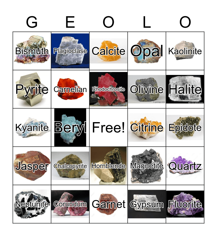 This bingo card has 29 images, a free space and 29 words: Neptunite, Aventurine, Beryl, Biotite, Bismuth, Calcite, Carnelian, Chalcopyrite, Citrine, Corundum, Epidote, Fluorite, Garnet, Gypsum, Halite, Hematite, Hornblende, Jasper, Kaolinite, Kyanite, Magnetite, Muscovite, Olivine, Pyrite, Opal, Plagioclase, Quartz, Rhodochrosite and Staurolite.