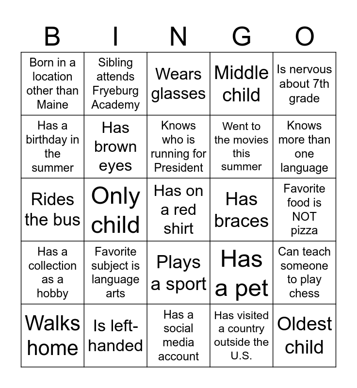 This bingo card has 25 words: Favorite subject is language arts, Has a social media account, Knows who is running for President, Walks home, Is nervous about 7th grade, Born in a location other than Maine, Has a birthday in the summer, Sibling attends Fryeburg Academy, Has braces, Plays a sport, Went to the movies this summer, Rides the bus, Has a pet, Can teach someone to play chess, Has brown eyes, Oldest child, Favorite food is NOT pizza, Wears glasses, Knows more than one language, Only child, Has on a red shirt, Is left-handed, Has a collection as a hobby, Middle child and Has visited a country outside the U.S..
