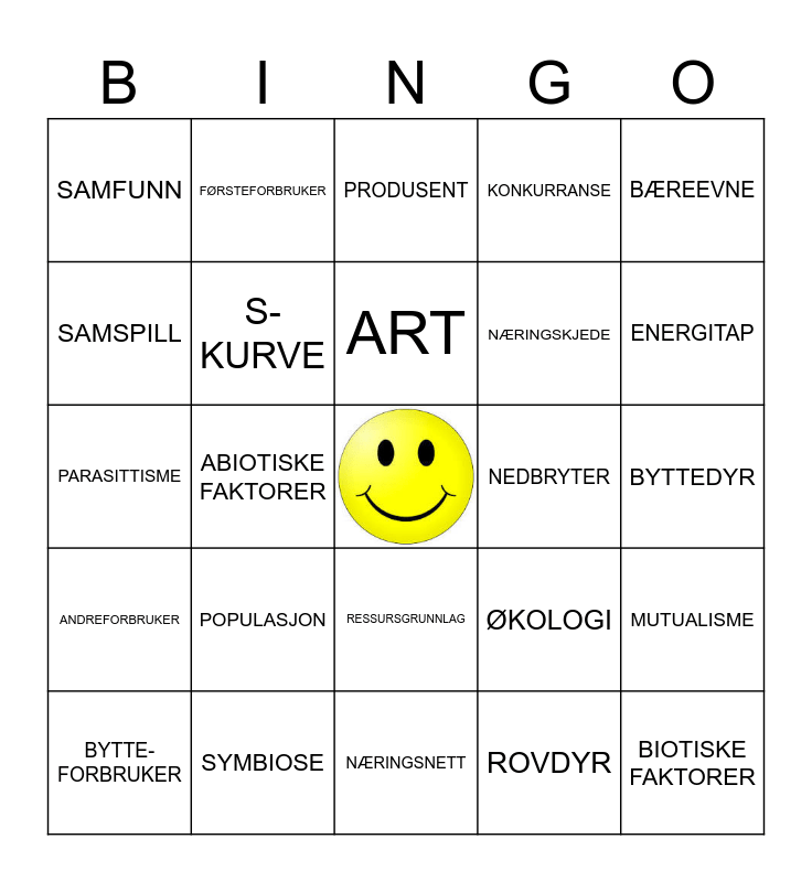 This bingo card has a free space and 27 words: ØKOLOGI, ØKOSYSTEM, NÆRINGSKJEDE, NÆRINGSNETT, SAMSPILL, PRODUSENT, FØRSTEFORBRUKER, ANDREFORBRUKER, NEDBRYTER, MUTUALISME, PARASITTISME, KONKURRANSE, BYTTE-FORBRUKER, SYMBIOSE, ENERGITAP, J-KURVE, S-KURVE, ART, POPULASJON, SAMFUNN, BYTTEDYR, ROVDYR, ABIOTISKE FAKTORER, BIOTISKE FAKTORER, RESSURSGRUNNLAG, BÆREEVNE and POPULASJONSVEKST.