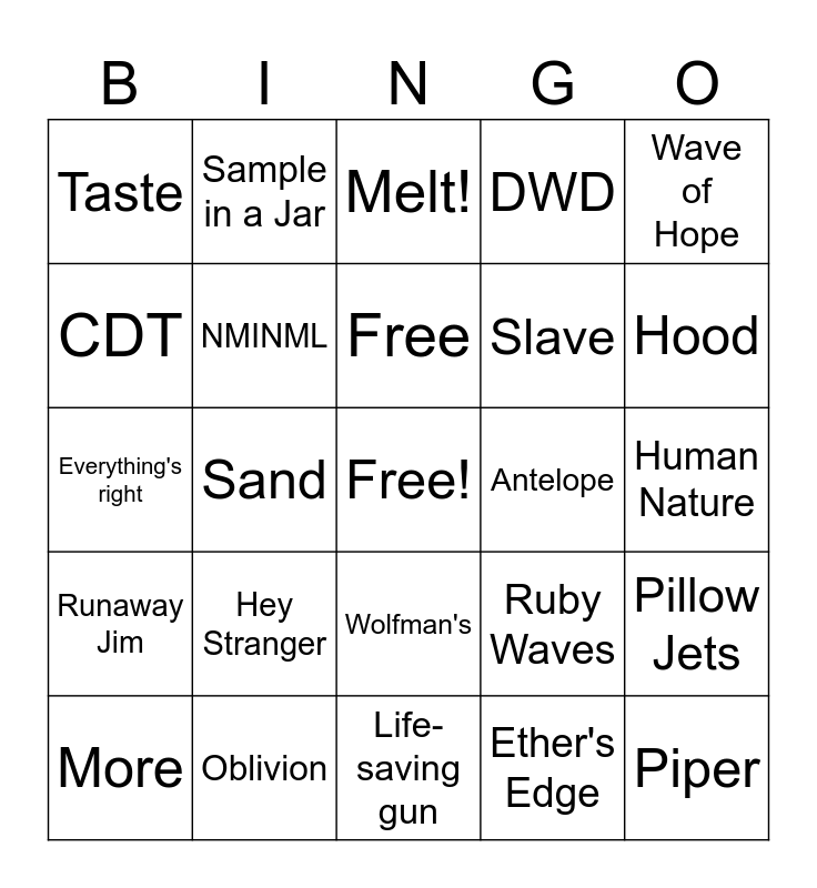 This bingo card has a free space and 24 words: Hey Stranger, Oblivion, Free, More, Wave of Hope, Taste, CDT, Sample in a Jar, Antelope, Wolfman's, Slave, Everything's right, Ruby Waves, Pillow Jets, NMINML, Ether's Edge, Human Nature, Melt!, Hood, Sand, Piper, Runaway Jim, DWD and Life-saving gun.