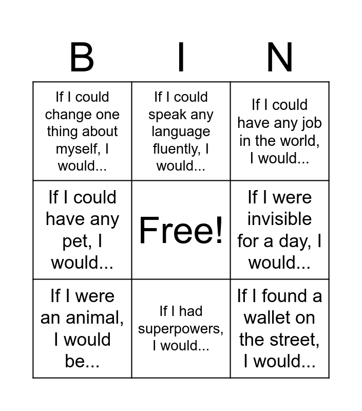 This bingo card has a free space and 20 words: If I won the lottery, I would..., If I had a time machine, I would..., If I could have any job in the world, I would..., If I were a teacher, I would..., If I had a million dollars, I would..., If I found a wallet on the street, I would..., If I could travel anywhere, I would..., If I could change one thing about myself, I would..., If I were the president, I would..., If I could speak any language fluently, I would..., If I could meet any celebrity, I would..., If I could be famous for one thing, it would be..., If I were invisible for a day, I would..., If I lived in another country, I would..., If I were an animal, I would be..., If I didn’t have to go to school, I would..., If I had superpowers, I would..., If I could have any pet, I would..., If I were a character in a movie, I would... and If I were rich, I would.