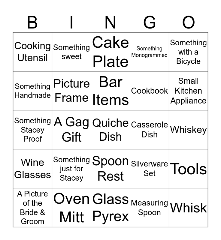 This bingo card has 50 words: Free!, Quiche Dish, Tupperware, Glass Pyrex, Something just for Stacey, Something just for Bennett, Something sweet, Something salty, Something Handmade, Wine, Picture Frame, Something Monogrammed, Tools, Silverware Set, Bedding, Something to Hang on the Wall, Bar Items, Casserole Dish, Baking Dish, Something with a Bicycle, A Gag Gift, Measuring Spoon, Cooking Utensil, Cookbook, Something Cast Iron, Whisk, Small Kitchen Appliance, Dishes, Cake Plate, Spoon Rest, Decorative Jars, Something Gold, Something Duke, Something for the Patio, Oven Mitt, Kitchen Towel, Cleaning Supplies, Vase, Cutting Board, Whiskey, Beer, Spices, Wedding Keepsake, Something for the Wedding, A Picture of the Bride & Groom, Something Stacey Proof, Something Fuzzy, Something Blue, Wine Glasses and Champagne Glasses.