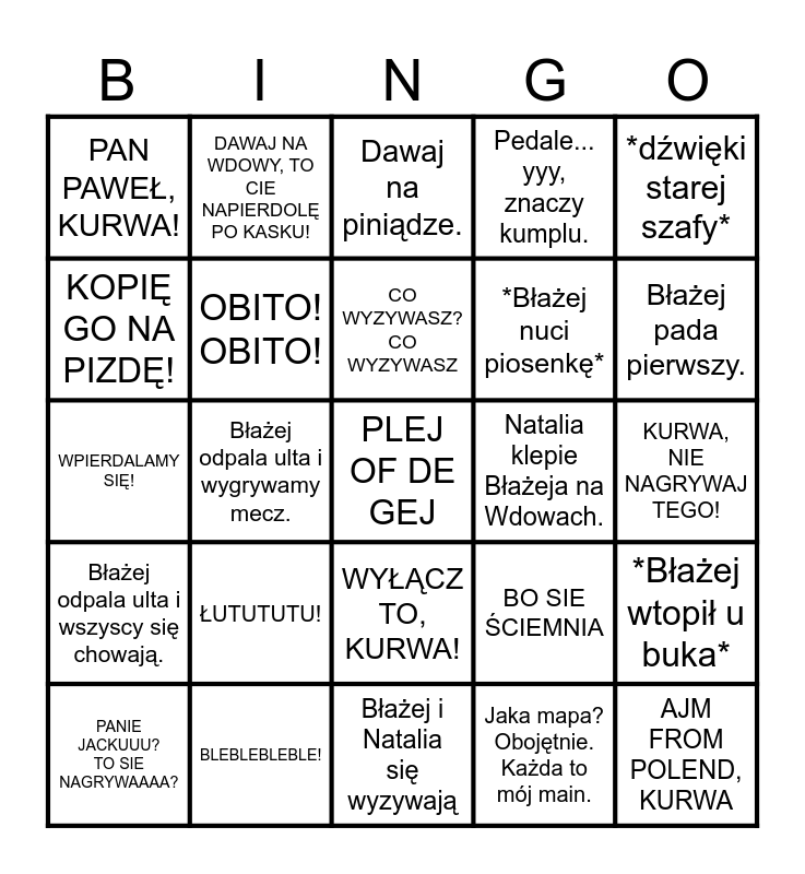 This bingo card has a free space and 24 words: ŁUTUTUTU!, BLEBLEBLEBLE!, CO WYZYWASZ? CO WYZYWASZ, PANIE JACKUUU? TO SIE NAGRYWAAAA?, *dźwięki starej szafy*, PAN PAWEŁ, KURWA!, KOPIĘ GO NA PIZDĘ!, DAWAJ NA WDOWY, TO CIE NAPIERDOLĘ PO KASKU!, Natalia klepie Błażeja na Wdowach., WYŁĄCZ TO, KURWA!, *Błażej nuci piosenkę*, WPIERDALAMY SIĘ!, BO SIE ŚCIEMNIA, *Błażej wtopił u buka*, OBITO! OBITO!, Jaka mapa? Obojętnie. Każda to mój main., KURWA, NIE NAGRYWAJ TEGO!, Dawaj na piniądze., Błażej pada pierwszy., Błażej odpala ulta i wygrywamy mecz., AJM FROM POLEND, KURWA, Błażej odpala ulta i wszyscy się chowają., Pedale... yyy, znaczy kumplu. and Błażej i Natalia się wyzywają.