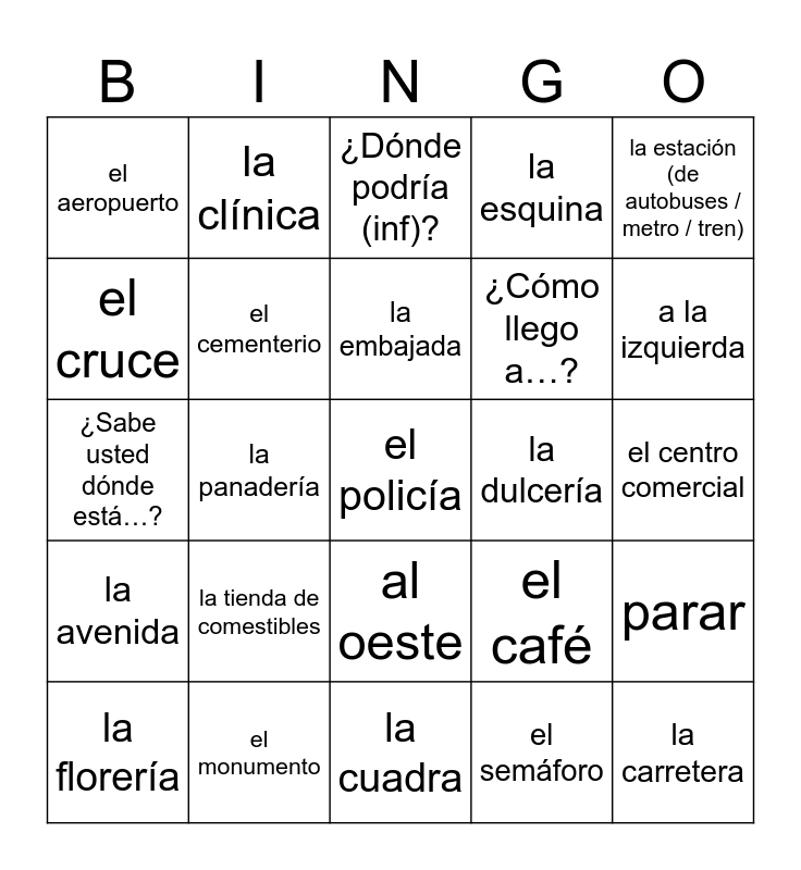 This bingo card has 73 words: ¡LIBRE!, la acera, el aeropuerto, el acuario, el almacén, el apartamento, la avenida, el ayuntamiento, el café, la carnicería, la carretera, la catedral, el cementerio, el centro comercial, el centro recreativo, la clínica, la cuadra, el cruce, la dirección, la dulcería, la embajada, la esquina, la estación (de autobuses / metro / tren), la ferretería, la florería, la frutería, la heladería, el hospital, la iglesia, el mercado, el monumento, la mueblería, el negocio, la oficina de correos, la panadería, la papelería, la peluquería, el puente, el policía, la plaza, el semáforo, la tienda de comestibles, la torre, la zapatería, Disculpe…, ¿Cómo llego a…?, ¿Dónde podría (inf)?, Estoy buscando…, ¿Me puede decir dónde hay…, ¿Sabe usted dónde está…?, No sé., Tiene que…, Gracias por la ayuda., al este, al noreste, al noroeste, al norte, al oeste, al sur, al sureste, al suroeste, doblar, a la derecha, a la izquierda, adelante, seguir (e:i) derecho, hacia, todo recto, parar, pasearse, perderse, caminar and salir de.