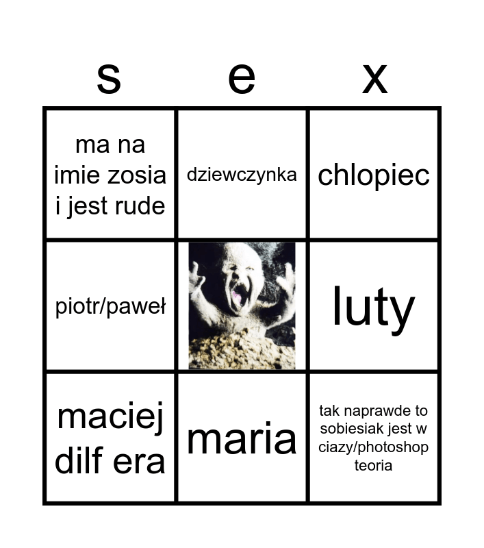 This bingo card has a free space and 8 words: luty, chlopiec, dziewczynka, maciej dilf era, ma na imie zosia i jest rude, tak naprawde to sobiesiak jest w ciazy/photoshop teoria, piotr/paweł and maria.