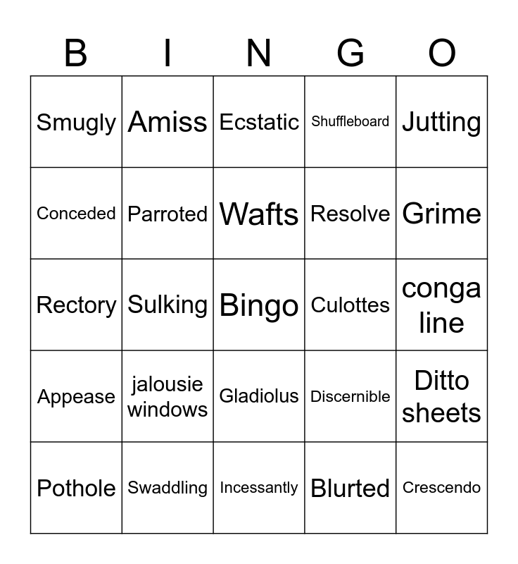 This bingo card has a free space and 28 words: Ditto sheets, Cornucopias, Resolve, Blurted, Conceded, Ecstatic, Amiss, Appease, Culottes, Pothole, Rectory, Shuffleboard, Swaddling, Incessantly, Grime, terrazzo floor, jalousie windows, Parroted, Wafts, Gladiolus, Smugly, Innards, Crescendo, Sulking, conga line, Discernible, Jutting and visas.