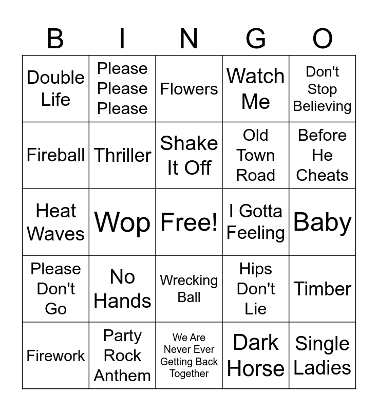 This bingo card has a free space and 24 words: Firework, No Hands, Shake It Off, Dark Horse, Don't Stop Believing, Double Life, Please Please Please, Flowers, I Gotta Feeling, Baby, Heat Waves, Thriller, Hips Don't Lie, Timber, Fireball, Party Rock Anthem, We Are Never Ever Getting Back Together, Watch Me, Before He Cheats, Please Don't Go, Wop, Wrecking Ball, Old Town Road and Single Ladies.