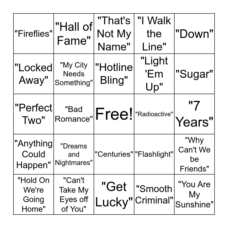 This bingo card has a free space and 24 words: "Dreams and Nightmares", "Can't Take My Eyes off of You", "Hotline Bling", "Hold On We're Going Home", "Down", "Fireflies", "Locked Away", "Hall of Fame", "Radioactive", "Centuries", "Light 'Em Up", "Perfect Two", "Flashlight", "Why Can't We be Friends", "My City Needs Something", "Smooth Criminal", "7 Years", "That's Not My Name", "Sugar", "Bad Romance", "You Are My Sunshine", "Anything Could Happen", "I Walk the Line" and "Get Lucky".