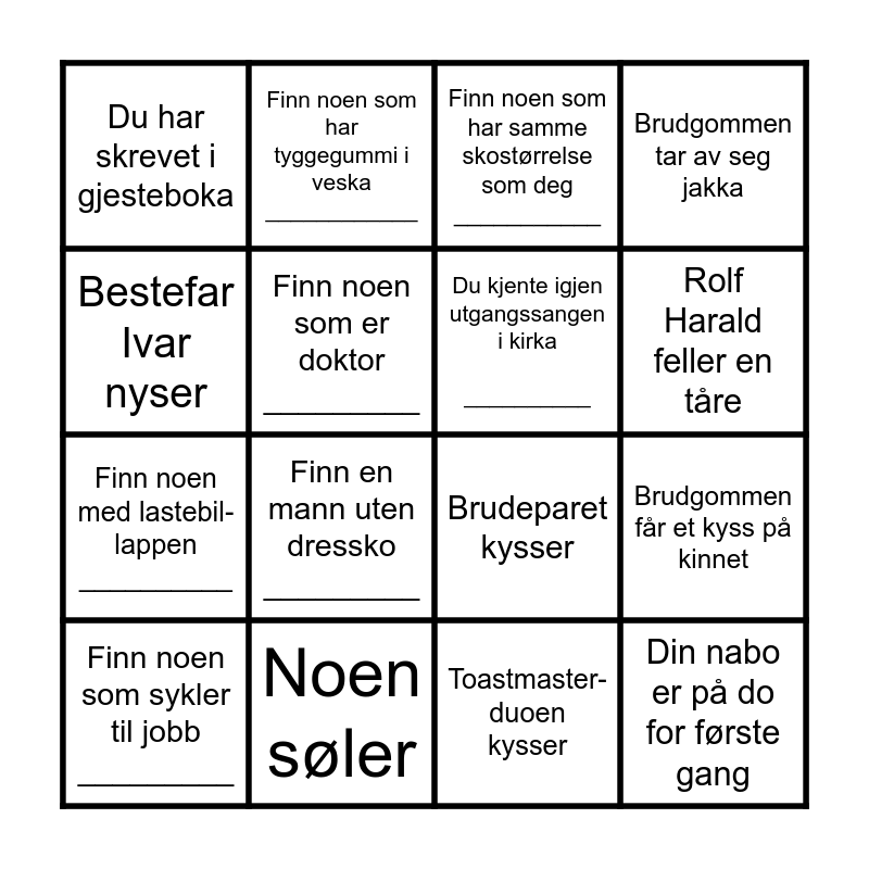 This bingo card has 20 words: Brudgommen får et kyss på kinnet, Finn noen som har bakt kake til bryllupet __________, Finn noen som har samme skostørrelse som deg ___________, Du har tatt en selfie med brudeparet, Finn noen som sykler til jobb _________, Bestefar Ivar nyser, Noen søler, Du har skrevet i gjesteboka, Finn noen med lastebil-lappen __________, Finn noen som har tyggegummi i veska ____________, Finn en mann uten dressko _________, Brudeparet kysser, Finn noen som er doktor _________, Din nabo er på do for første gang, Du kjente igjen utgangssangen i kirka __________, Odd står på hendene, Rolf Harald feller en tåre, Brudgommen tar av seg jakka, Toastmaster-duoen kysser and Noen sier "Skål".