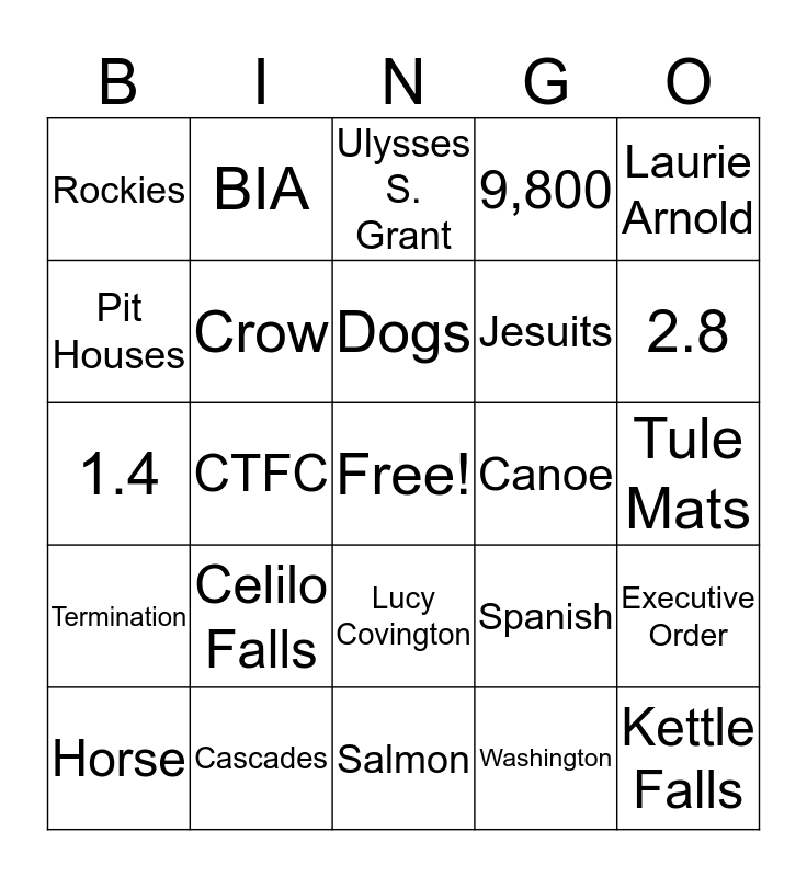 This bingo card has a free space and 24 words: Celilo Falls, Cascades, Dogs, Horse, Laurie Arnold, Rockies, Pit Houses, BIA, Canoe, Lucy Covington, Jesuits, 1.4, Spanish, Executive Order, Crow, Washington, Tule Mats, Ulysses S. Grant, 2.8, CTFC, Kettle Falls, Termination, 9,800 and Salmon.